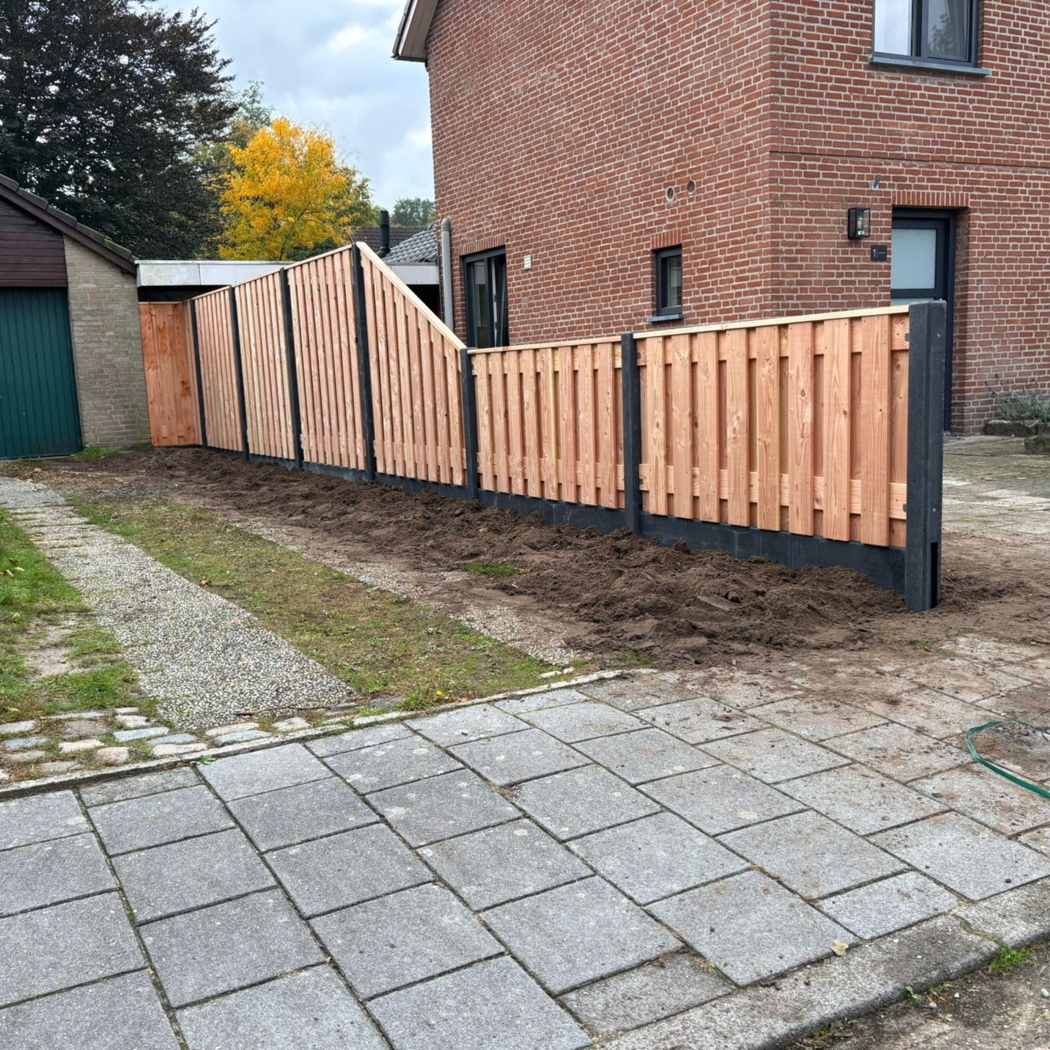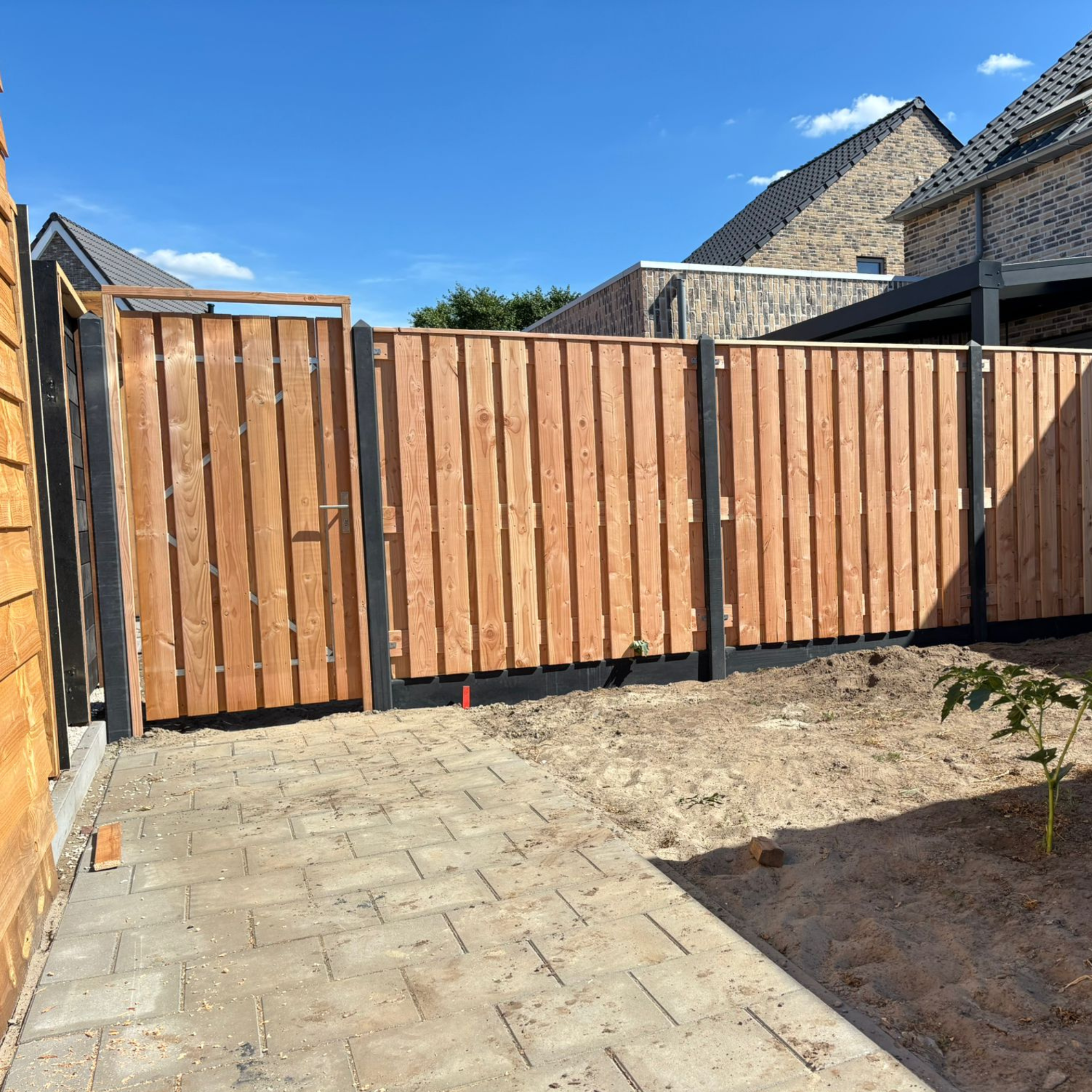De warme kleur van Douglas hout zorgt voor een natuurlijke uitstraling die mooi vergrijst in de loop der tijd. In combinatie met beton ontstaat een tijdloze en onderhoudsarme erfafscheiding die past bij zowel moderne als klassieke tuinen.