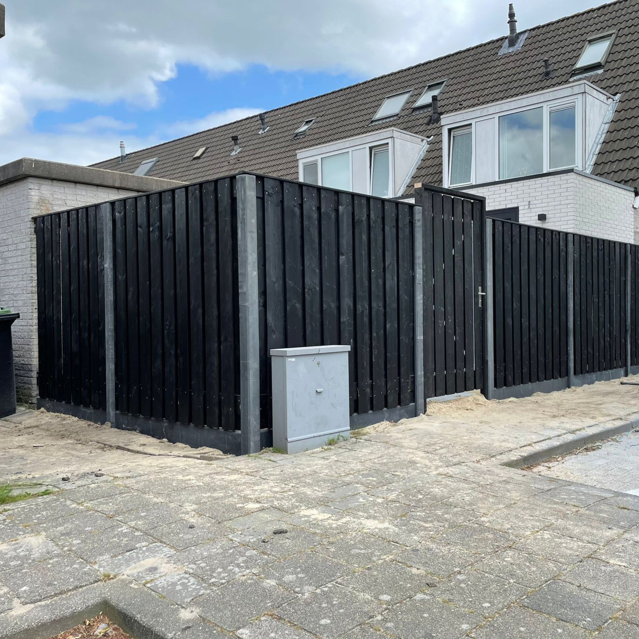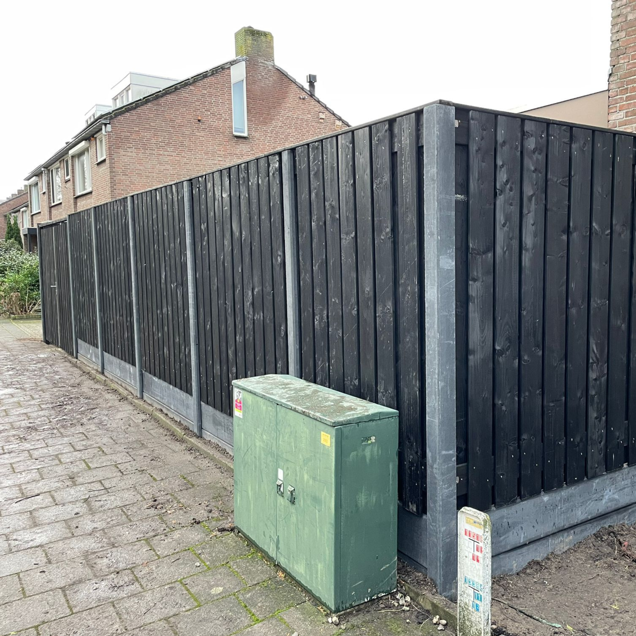 Zwart grenen hout geeft de omheining een strakke en luxe uitstraling, terwijl de betonnen palen en onderplaten zorgen voor stabiliteit en een lange levensduur. Het hout is geïmpregneerd en zwart afgewerkt, waardoor het bestand is tegen vocht, insecten en weersinvloeden.