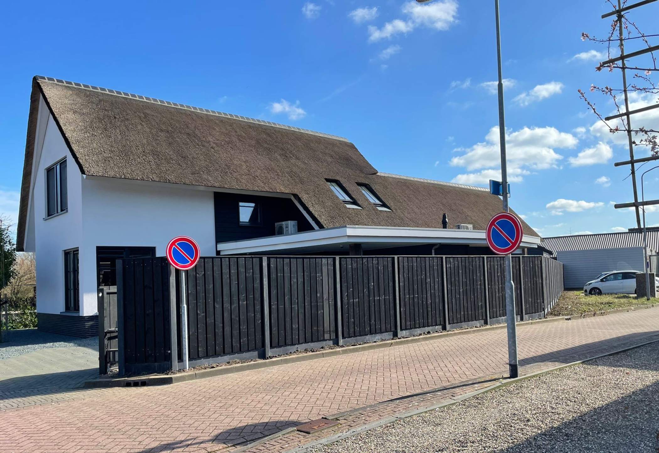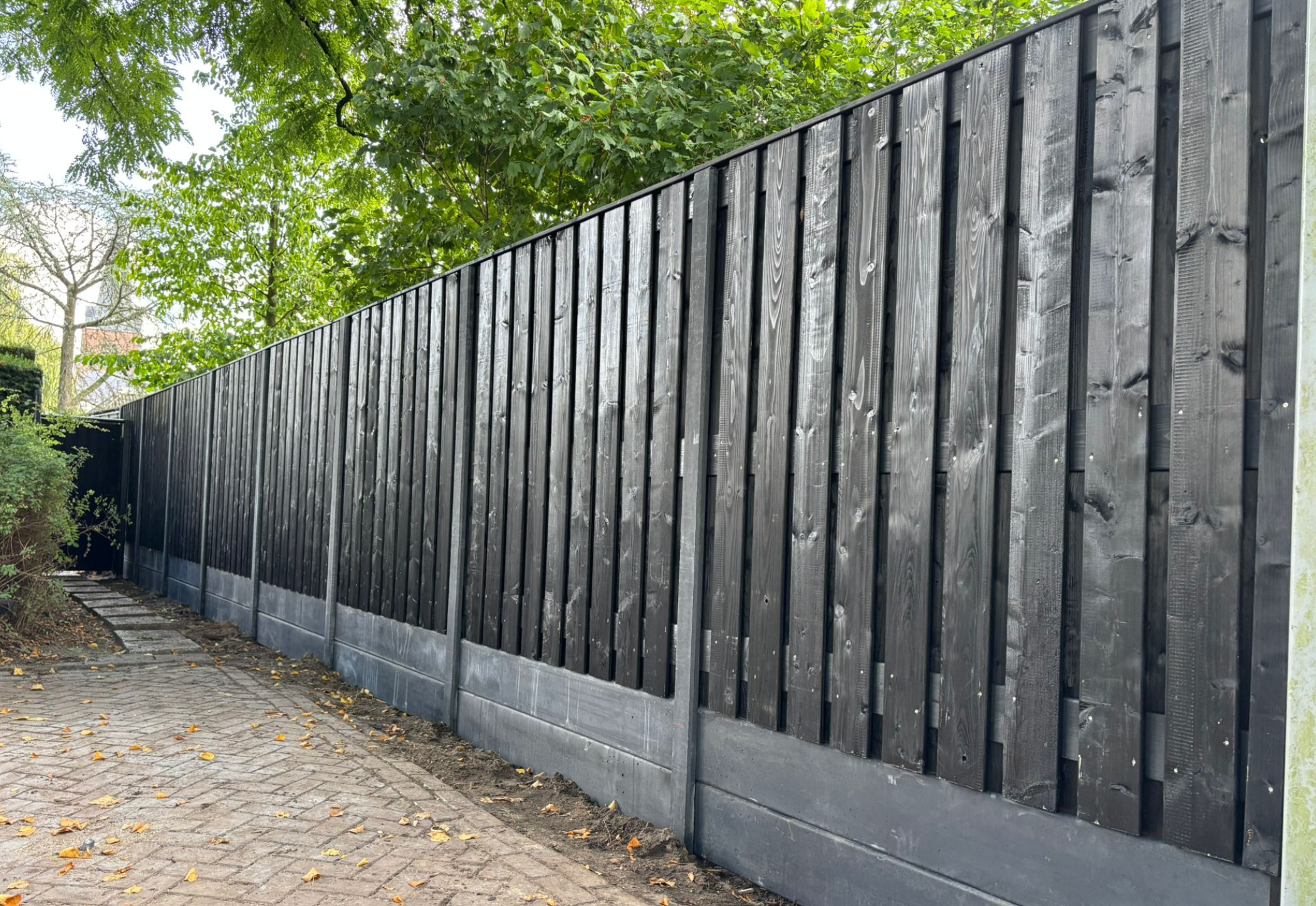 Deze combinatie van zwart hout en beton creëert een krachtige, moderne erfafscheiding die past bij strakke, eigentijdse tuinen maar ook een stijlvol contrast vormt in klassieke buitenruimtes.