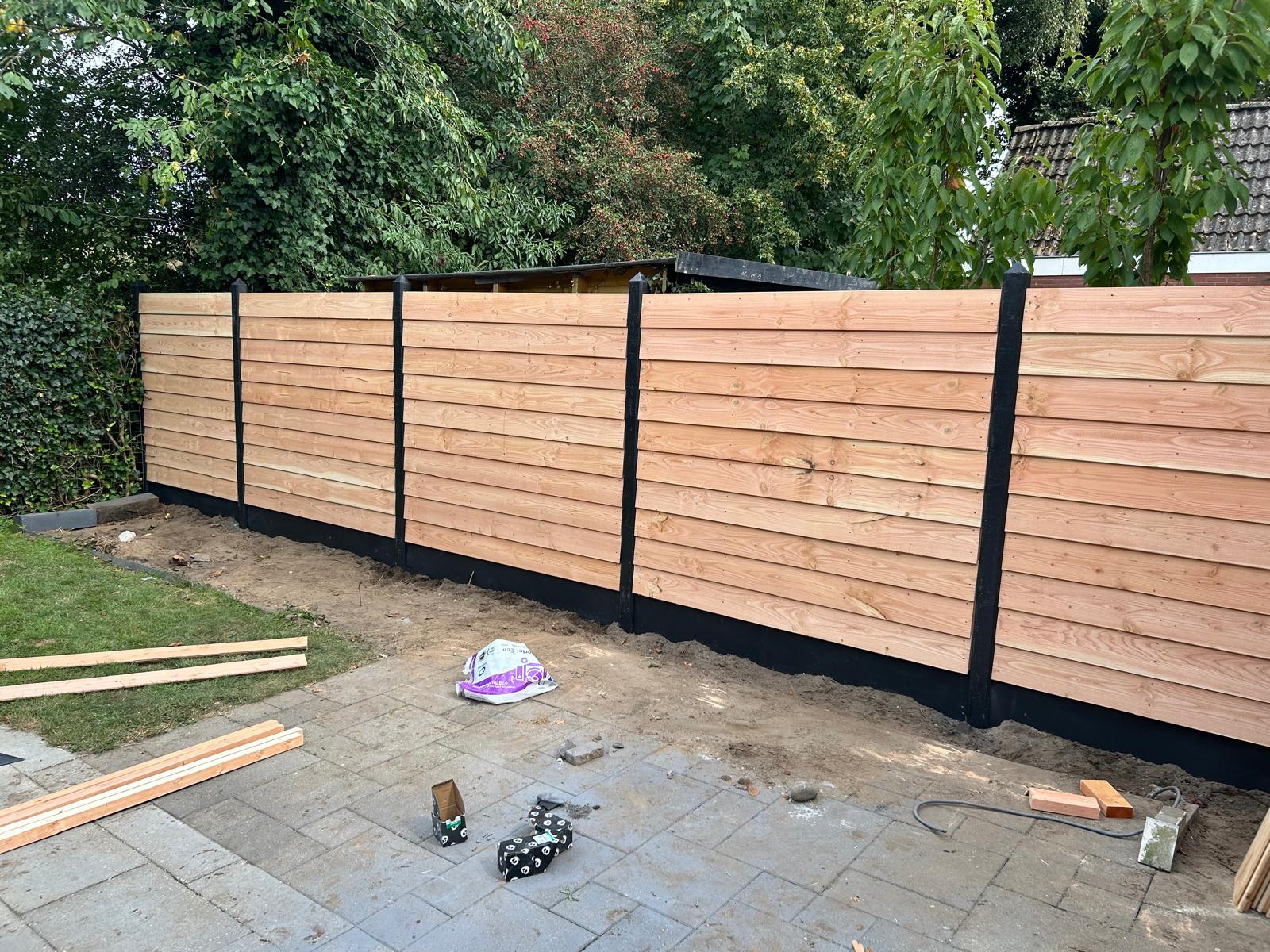 De schermen zijn verkrijgbaar in 19-, 21- en 23-planksuitvoering, zowel verticaal als horizontaal geplaatst. Alle panelen worden volledig RVS geschroefd en gemonteerd tussen betonpalen met onderplaten in grijs of antraciet. Tijdens de montage worden pasvakken exact op maat gemaakt en wordt de schutting afgewerkt met een nette houten afdeklat.