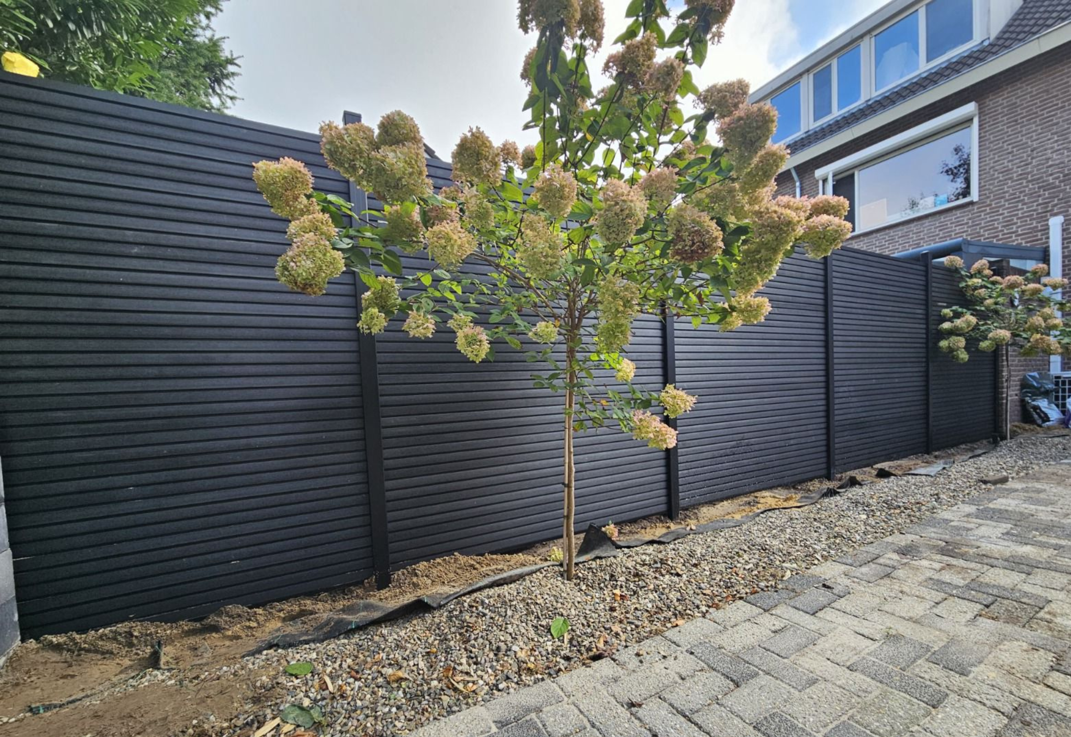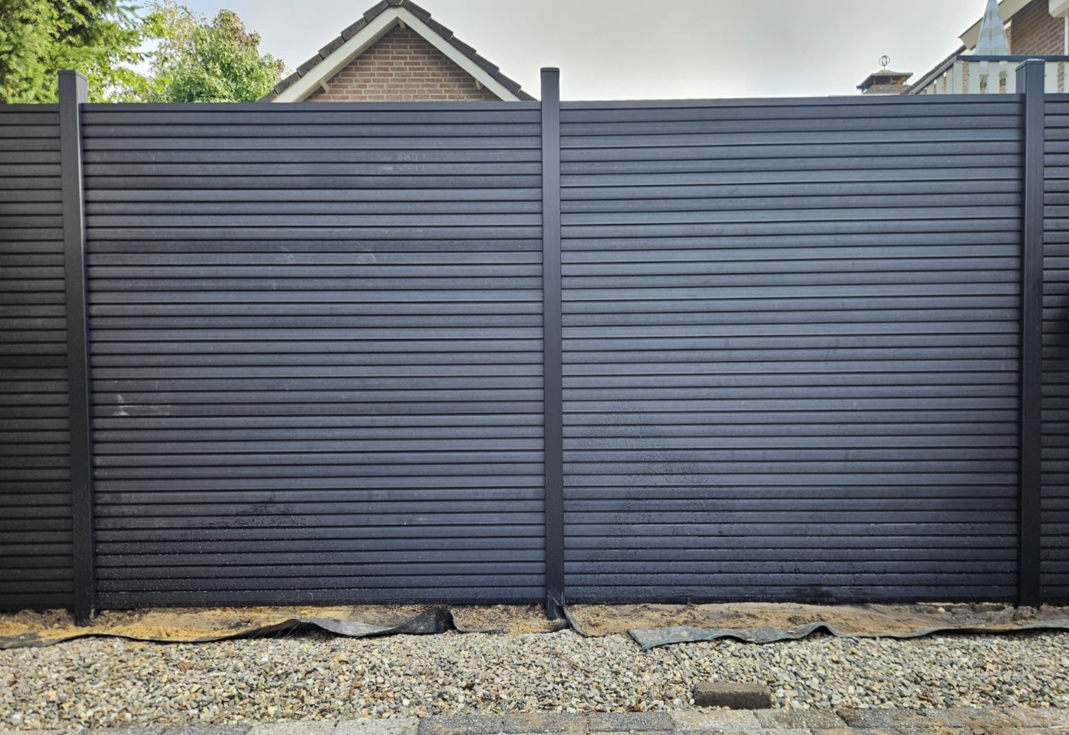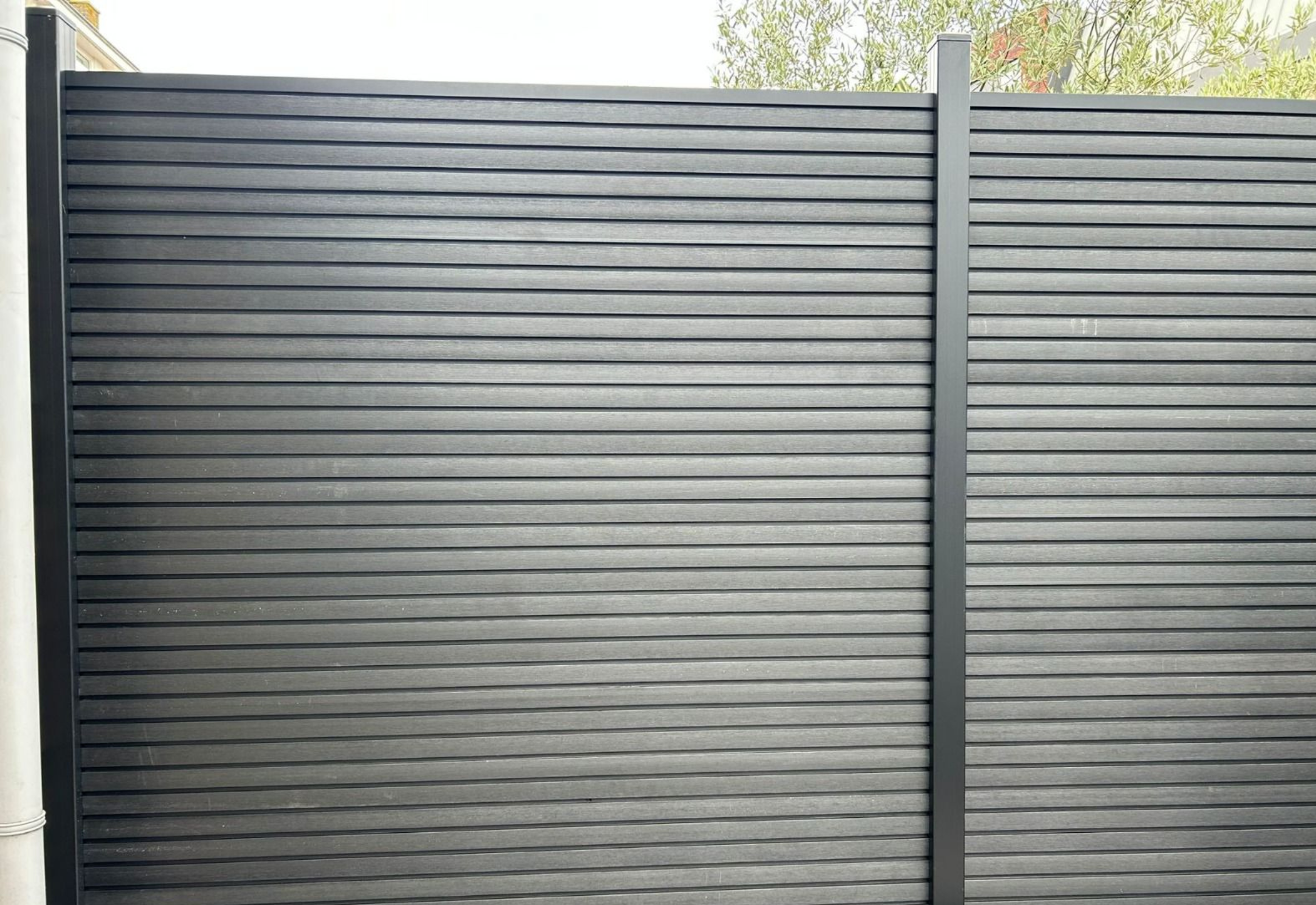Met de combinatie van rhombus-profiel en diepe zwarte houtnerf creëert deze schutting een krachtige, moderne uitstraling die een statement vormt in elke buitenruimte.