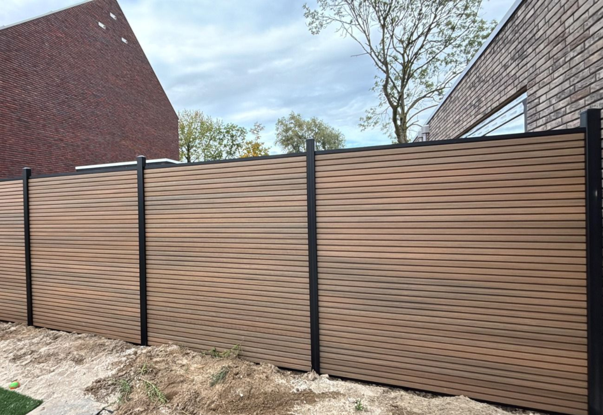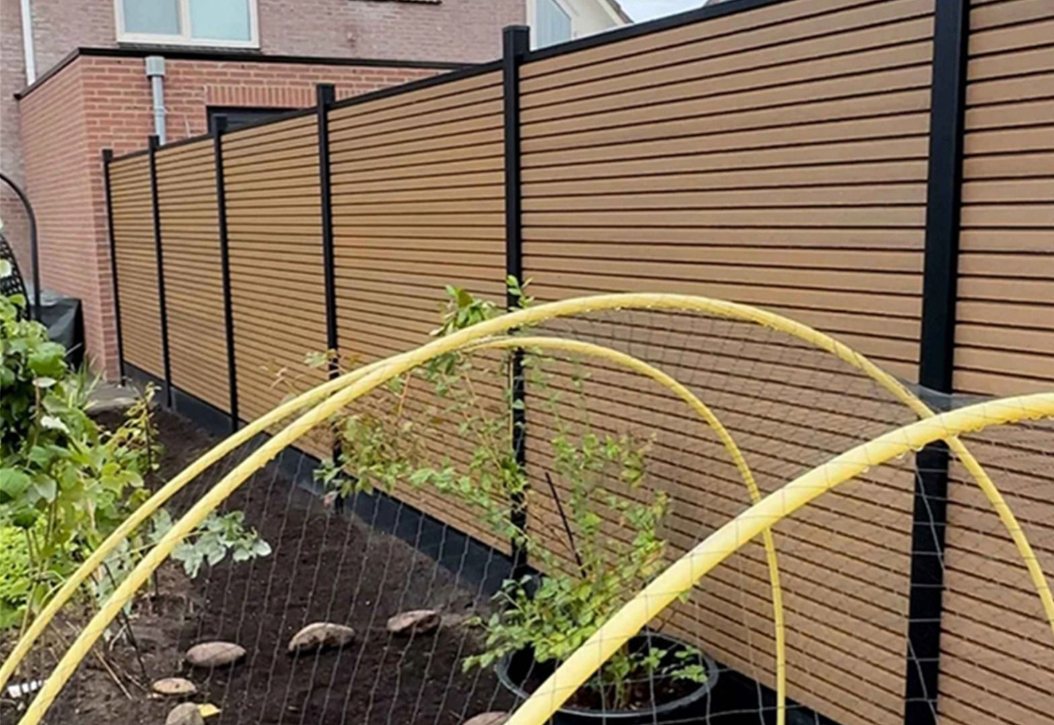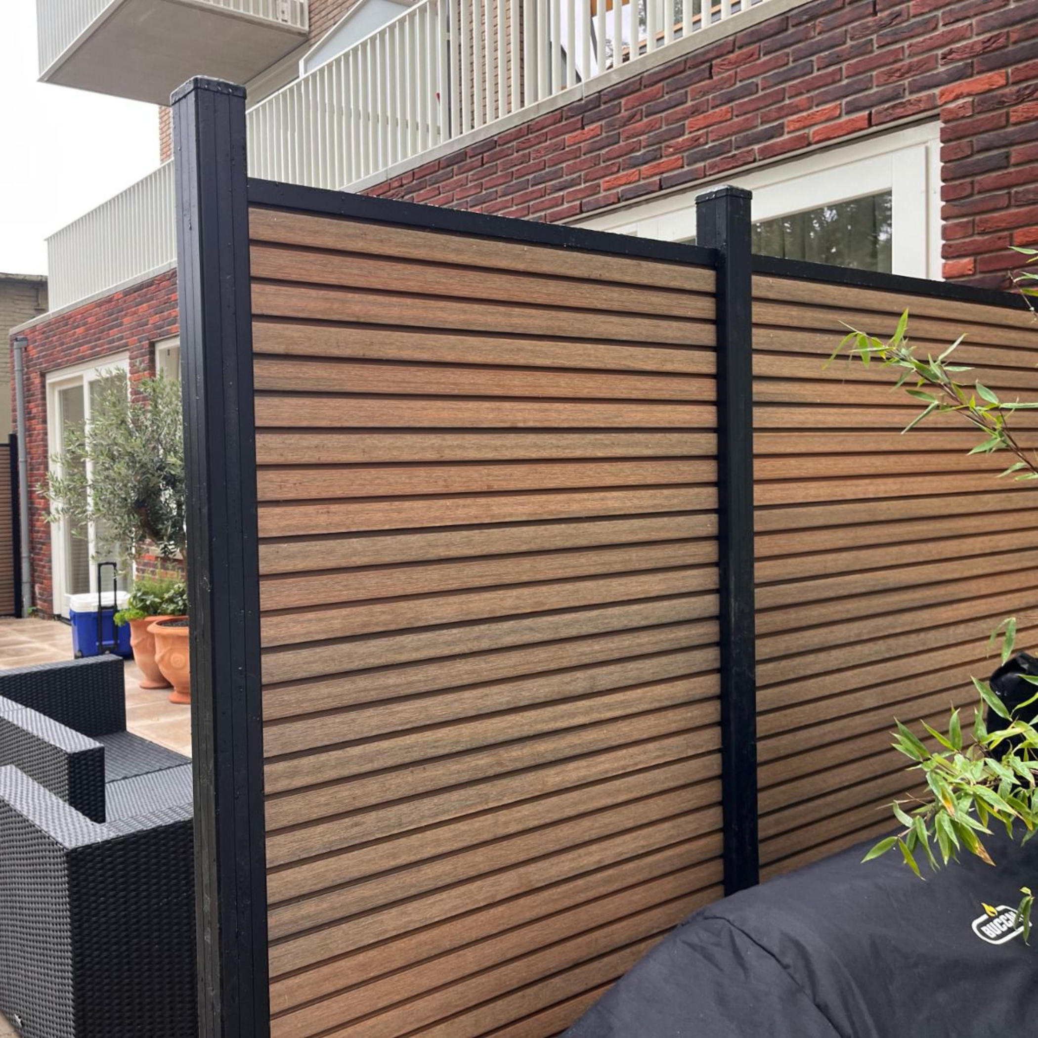 Het rhombus-profiel creëert een strak horizontaal lijnenspel dat in veel moderne tuinontwerpen terugkomt. Het composietmateriaal is vormvast, splintervrij en volledig bestand tegen vocht, insecten, verkleuring en extreme weersomstandigheden. In combinatie met een solide constructie ontstaat een hoogwaardige erfafscheiding die jarenlang strak en stabiel blijft.
