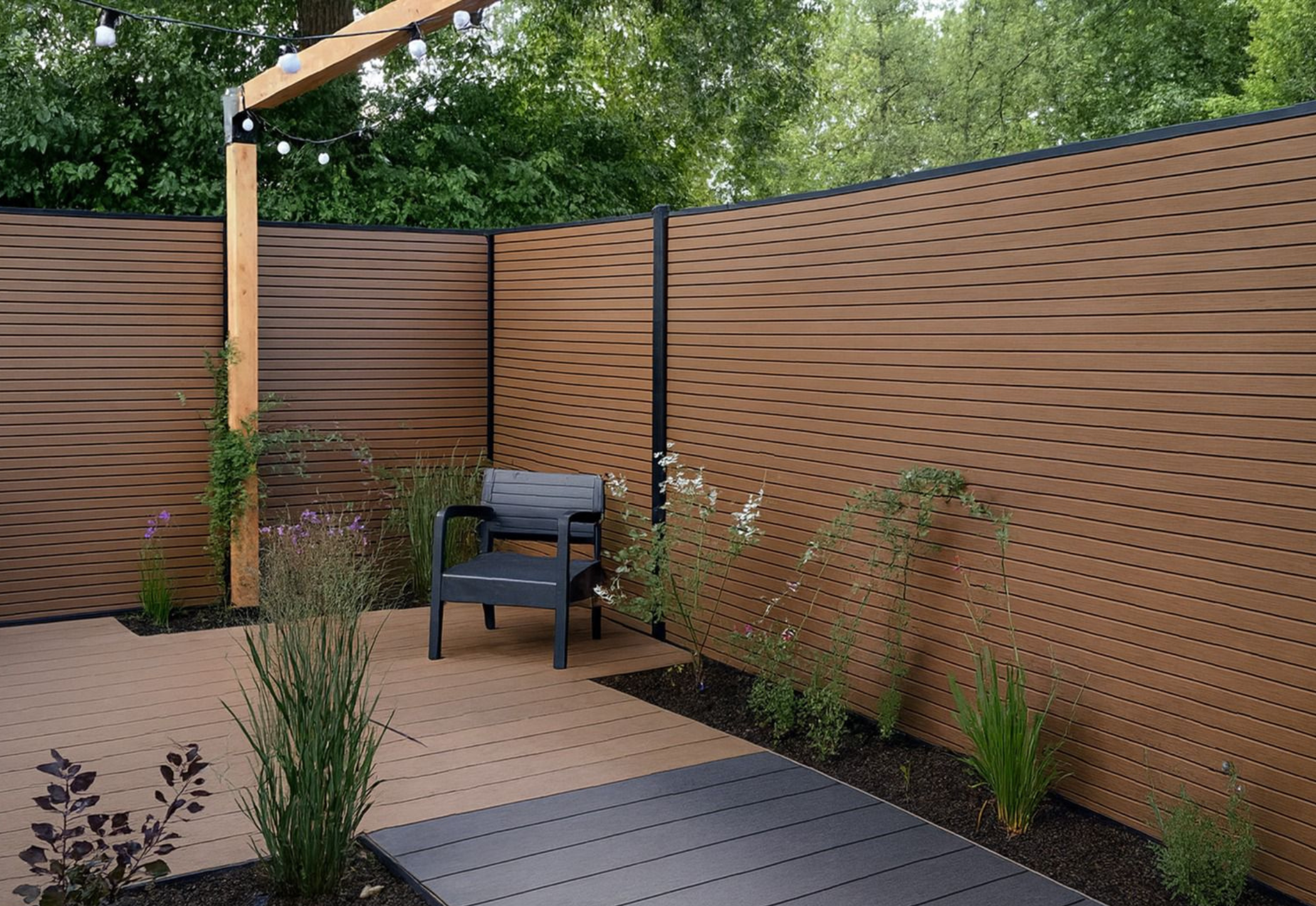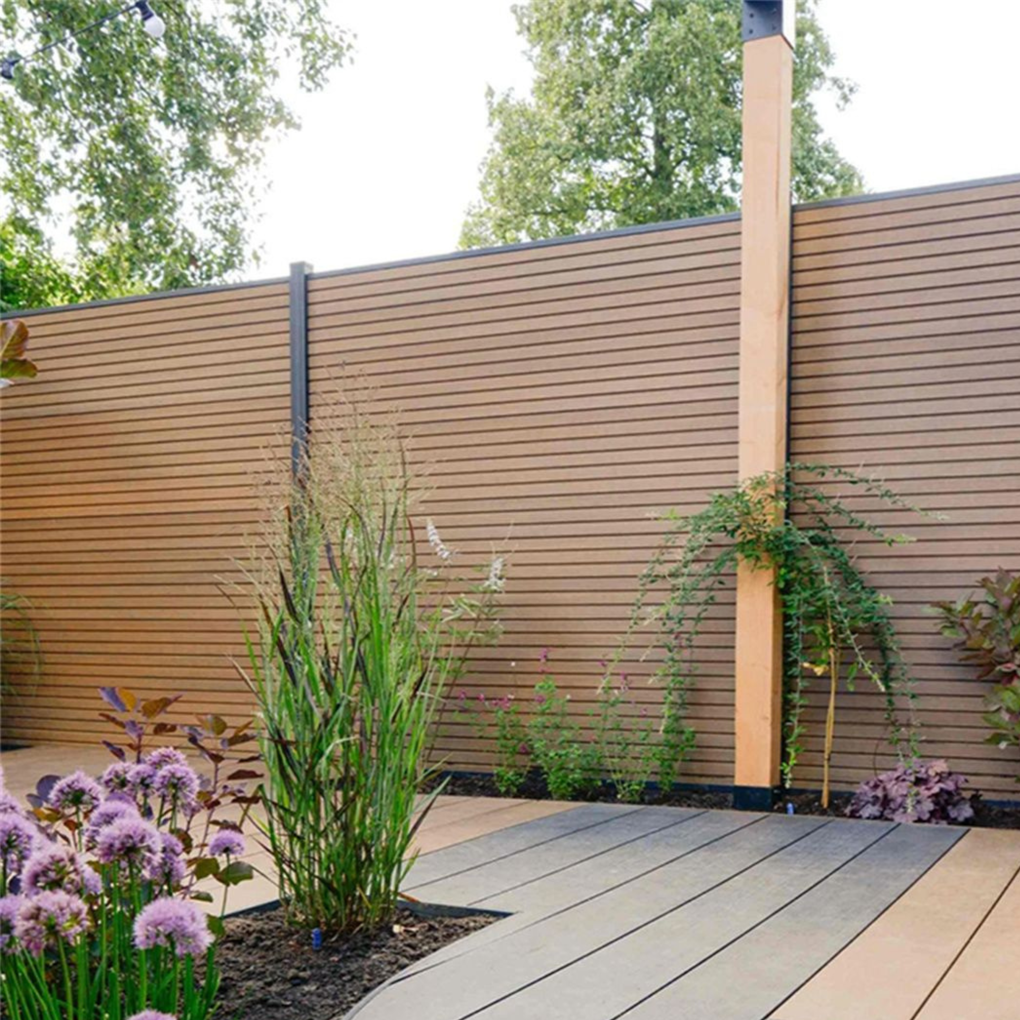 De combinatie van het luxe rhombus-profiel en de warme teak houtnerf zorgt voor een moderne, tijdloze uitstraling die in zowel strakke als luxe tuinen perfect tot zijn recht komt.